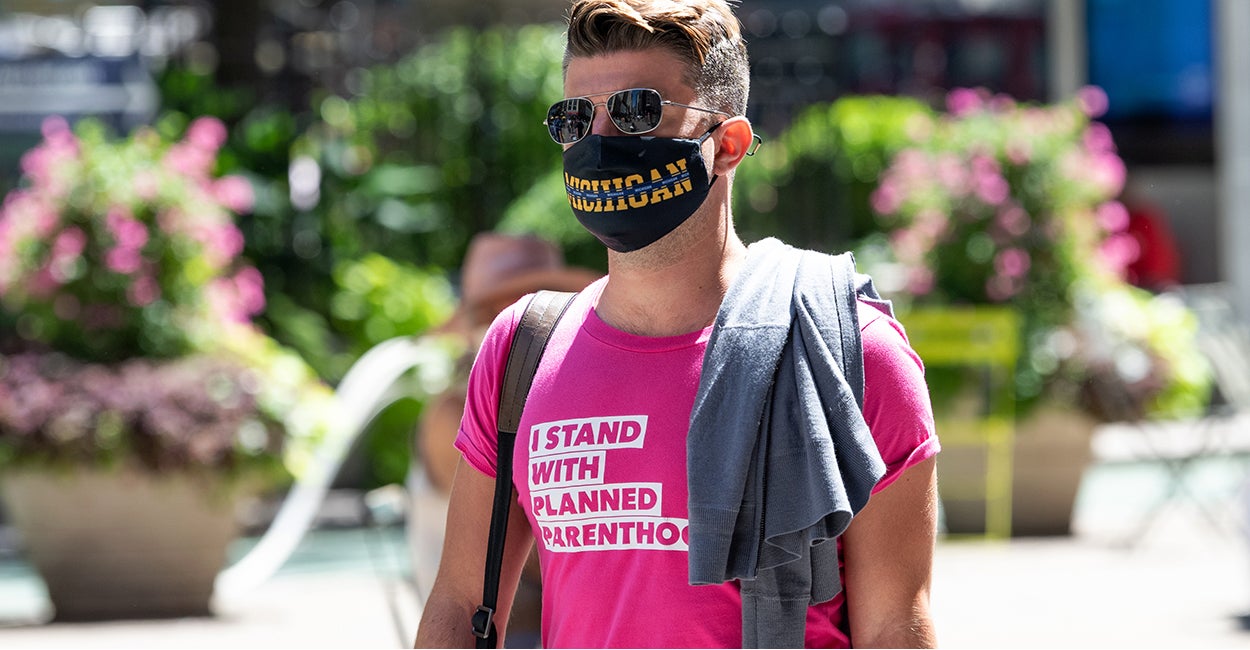 A man wearing a "I Stand With Planned Parenthood" T-shirt walks near Herald Square as the city continues Phase 4 of reopening following restrictions imposed to slow the spread of the coronavirus Aug. 20, 2020, in New York City. (Photo: Alexi Rosenfeld/Getty Images)